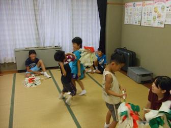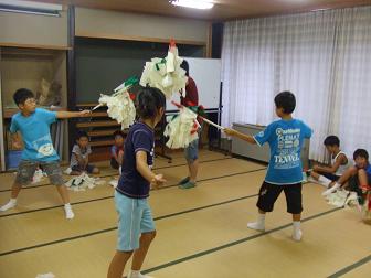 走り回り、御幣でたたきあい、その結果御幣の紐がとれたと泣くは、これは僕の御幣だ、違う僕のだと取り合い。