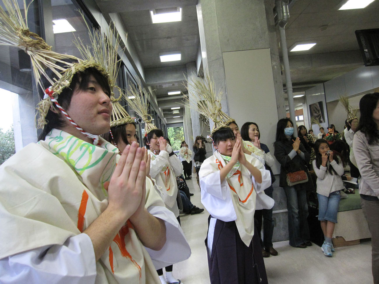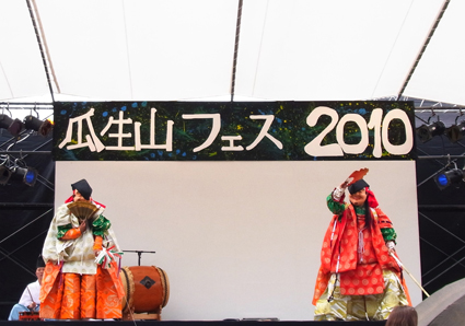 そして、最後はこの祭りオリジナルの演目『五観之げ音頭』。踊りに我々、京都瓜生山舞子連中の奏楽陣で拍子をつけました。踊り手は頭になんともこれまた日本風といったワラでつくった三角帽子をかぶって楽しく歌いながら踊られていました。
