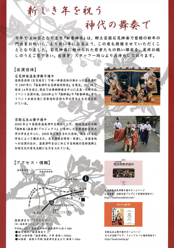 「石見神楽温泉津舞子連中」と京都造形芸術大学の学生による「京都瓜生山舞子連中」とが協力し地域活性化を目指し、
