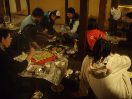 前日から仕込んでいたカレーと、京都からわざわざ持ってきた、たこ焼き機と材料によるたこ焼きと、31日間お好み焼きで生きられると豪語するT真さんによるお好み焼きに舌鼓を打ち、大量のお菓子をつまみに、二日間の公演のビデオを見ました。