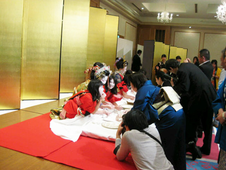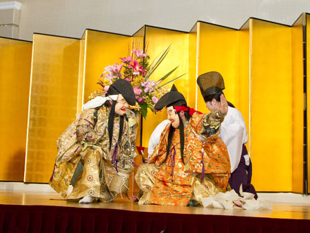 流しと共に金屏風が左右に開き奏楽陣が現れ、スポットライトに照らされます。