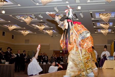 今回も金屏風が後ろに・・・ということで奏楽陣は急きょ横に移動し舞うスペースを確保。
