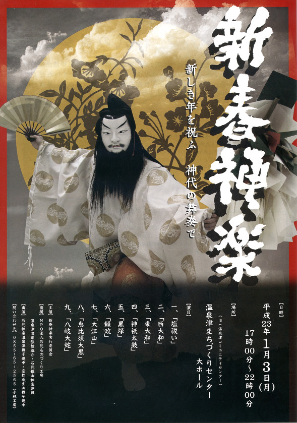また、新春神楽では毎年7〜9演目を石見神楽温泉津舞子連中、そして京都瓜生山舞子連中の2団体で行っています。また石見神楽だけでなく、ご飯やお酒など出店もあります。(出店についてはこれから交渉します!今年もよろしくお願いいたします!)