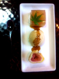 牛乳、卵など、動物性食品を全く使わずに作った、ヘルシーな胡麻アイスと、ぶどうの寒天寄せと、イチジクの天ぷらです。